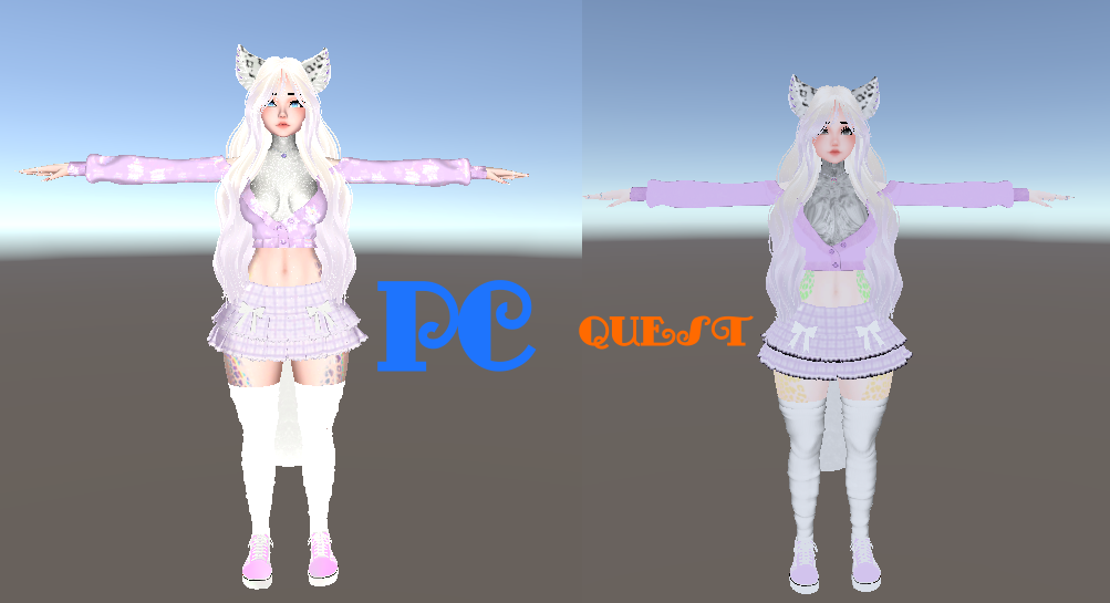 This avatar IS quest compatible, BUT, I do not specialize in making quest avatars, the quest version is only functional enough so quest users do not see a fallback. Please know this avatar is made with PC in mind!!!